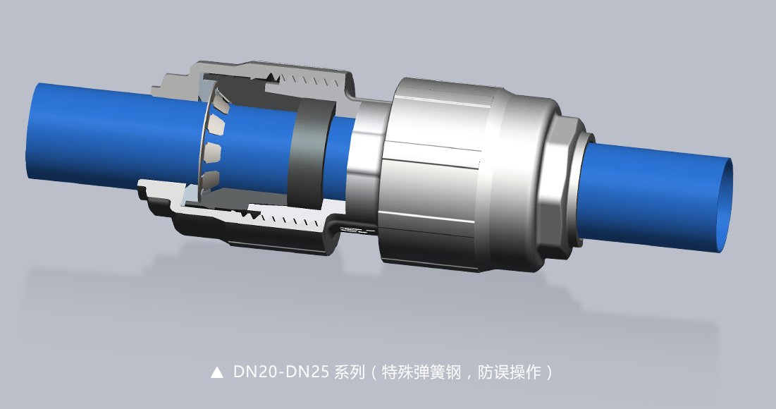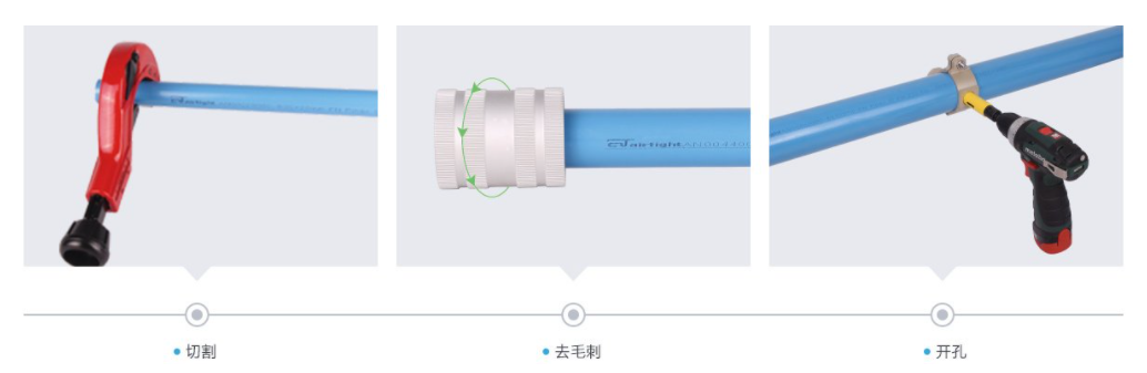 快速安装,无需焊接、粘合或压接密封处理,安装作业简单 不需要深入培训,重量轻,易于切割,易于在现场施工,所有管件及接头可灵活调整,可拆卸重复使用